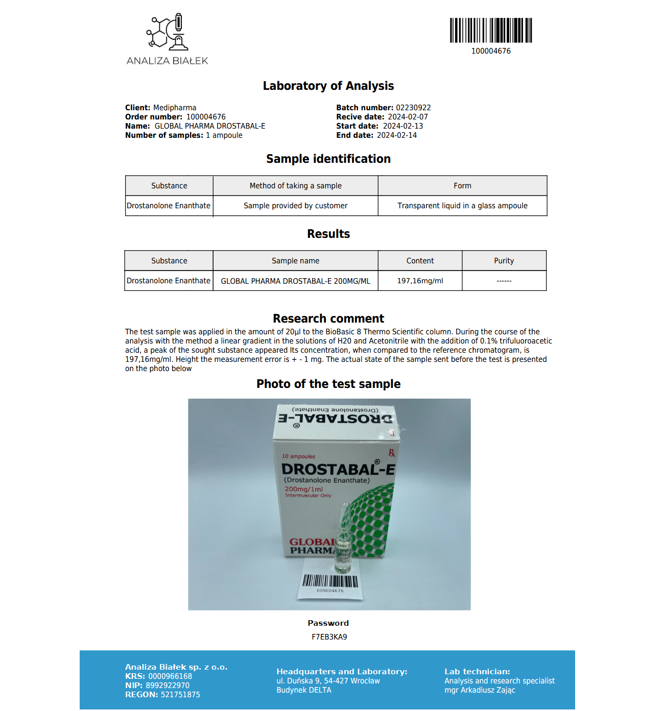 Global Pharma Drostabal-E 200mg Masteron Enanthate ist eine Premium-Injektionslösung von Masteron (Drostanolone Enanthate), die häufig in Forschungs- und Bildungsanwendungen verwendet wird. Das Produkt überzeugt durch hohe Qualität und konstante Zusammensetzung, wodurch es eine zuverlässige Wahl für erfahrene Nutzer ist, die mit injizierbaren Anabolika in kontrollierten Umgebungen arbeiten möchten. Drostabal-E wird ausschließlich für Forschungszwecke angeboten und nicht für Freizeitgebrauch.